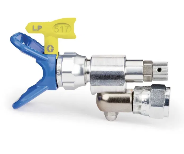 Распылительная насадка Graco CleanShot в комплекте с соплом RAC X LP 517 накручивается на любые удлинители (удочки) с резьбой 7/8 дюйма. Она позволяет избежать «плевков» краски, которые довольно часто образуются в начале и конце работы при использовании удлинителей, а поворотный механизм на 180 градусов дает возможность прокрашивать труднодоступные места. Используется только в безвоздушном распылении.